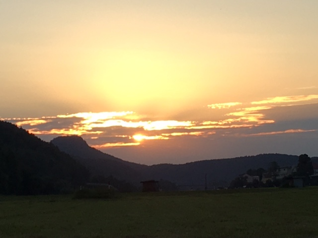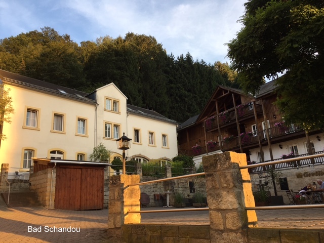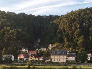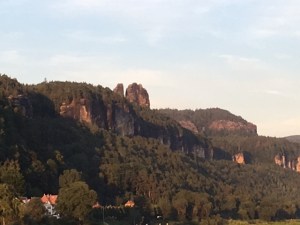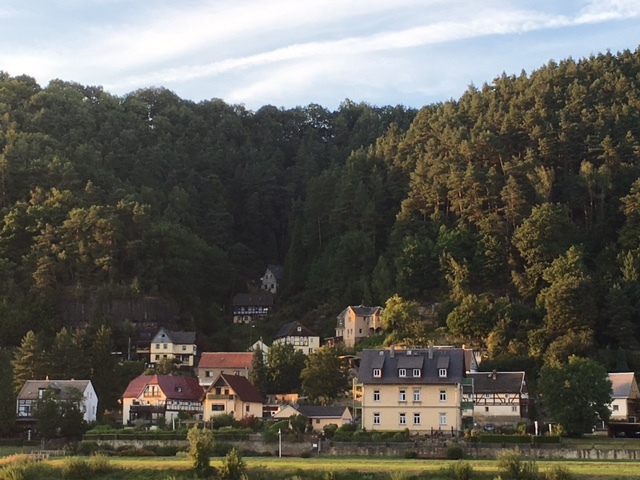 and had our afternoon cappuccino among cute shops and cafes. We thought we were staying in Bad Schandau and were surprised to discover that although the address said Bad Schandau, our hotel was actually across the Elba in a small town with few services. We had been looking forward to using the thermal baths as we had done a few years ago in the Black Forest spa of Baden Baden, bur this was not to be. We had a very nice meal at the only restaurant in town and settled for a walk and beautiful sunset instead of a bath.