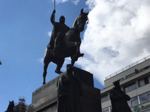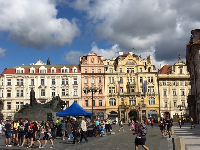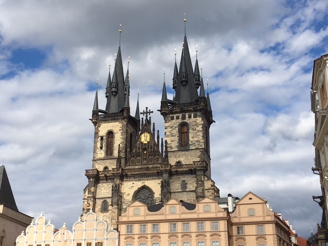 It was only a 5 minute walk from the new hotel to the old city main square so we were off sightseeing in no time. We had downloaded Rick Steve’s walking tour of Prague and spent most of the day following it through our smart phones. The tour was really great, relaxing, easy to follow & filled with the history of Prague and the Czech people. The country was bounced around like a ping pong ball between sovereignties for most of the last 3 centuries which finally led to democracy after 1989 and separation from Slovakia in the 1990’s. Prague is truly a beautiful city marred only by the hoard of tourists that crowd the streets (including us). It was not bombed in WWII. The following are some of the buildings we saw on this beautiful day.