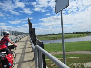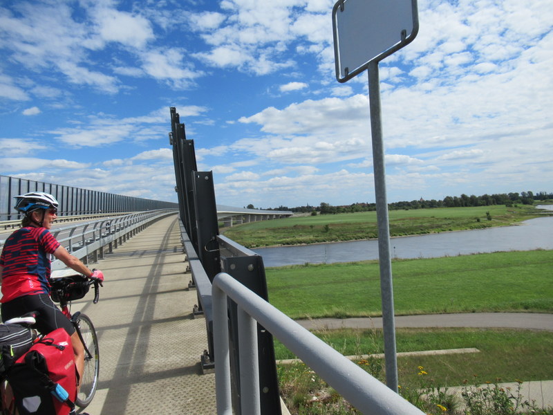 During breakfast a women (65yrs) from Holland struck up a conversation with Maggie. She is cycle touring by her lonesome along the Elbe. We enjoyed a friendly chat and compared observations before going our separate ways. It was already hot and sunny when we left the hotel at 0915 as were the last 4 days. We had a little trouble finding our way out of town and on course due to many street closures because of construction. When we finally did find our way we crossed the river over a really nice pedestrian and bicycle bridge one of many we’ve come across.