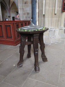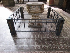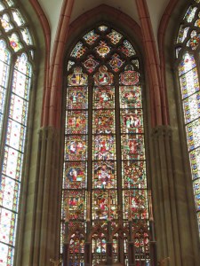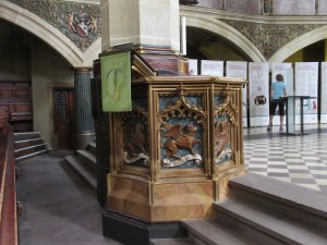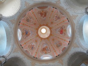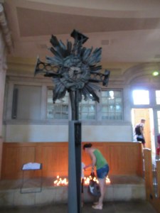 which was destroyed during the war and rebuilt in the 1990’s. The inside looks more like a theater than a church, except for the religious trappings and the burning candles. Nevertheless it is quite pretty with balcony seating all around.