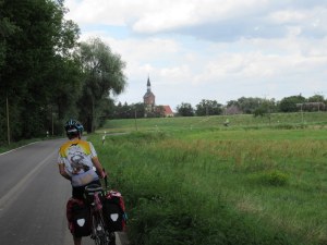 At the suggestion of our hotel host we crossed to the east side of the Elbe by ferry about 3 blocks from our hotel. It was a sleepy Sunday morning and we were the ferry’s first customers for the day. The ferry was ours. We rode along through small villages until around 1100 when we again crossed the river into Miessen.