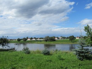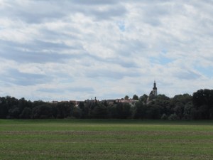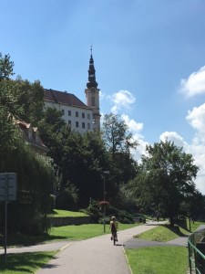 We rode for close to two hours without getting lost before we were out of the penumbra of Prague. It is such a huge sprawl, but traffic was not bad and the drivers fairly courteous. Before leaving Prague, we stopped at a bike shop and Maggie had new brakes installed. Her’s were worn down to the metal and had no braking power left. Although there were no steep climbs today, there were many ups and downs that kept us puffing as we haven’t ridden much uphill along the Elbe. The landscape changed a couple of times from mostly plains and river valley to very hilly and forested then back to a river valley and little hills. There were a number of quite pretty lakes as we neared Tynec.
