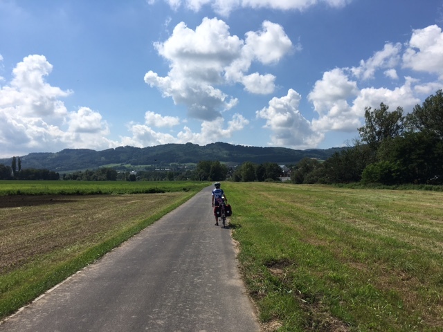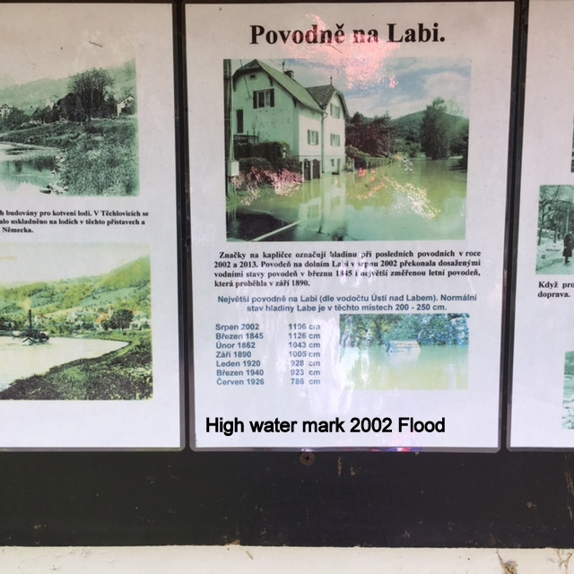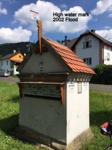 We had a fine hotel breakfast before hitting the road on this humid, warm, sunny, windless day. We got to the Czech Republic border after about 10 kms. The scenery and villages change dramatically along this route, although for the most part the cycle paths are in good condition in both Germany and the Czech Republic. The ride was mostly flat as you would expect along the river,
