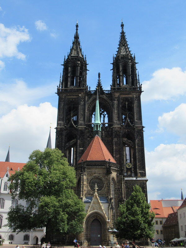After a good German breakfast that came with the lodging, we hit the road, but not before we saw Chris and George from our hotel window riding past our hotel and called out good morning to them. It was warm, but not hot today, but he wind in our faces was fairly strong. We had another non-motorized ferry ride just before coffee in the courtyard of a castle and the view of the landscape then on to Torgau.