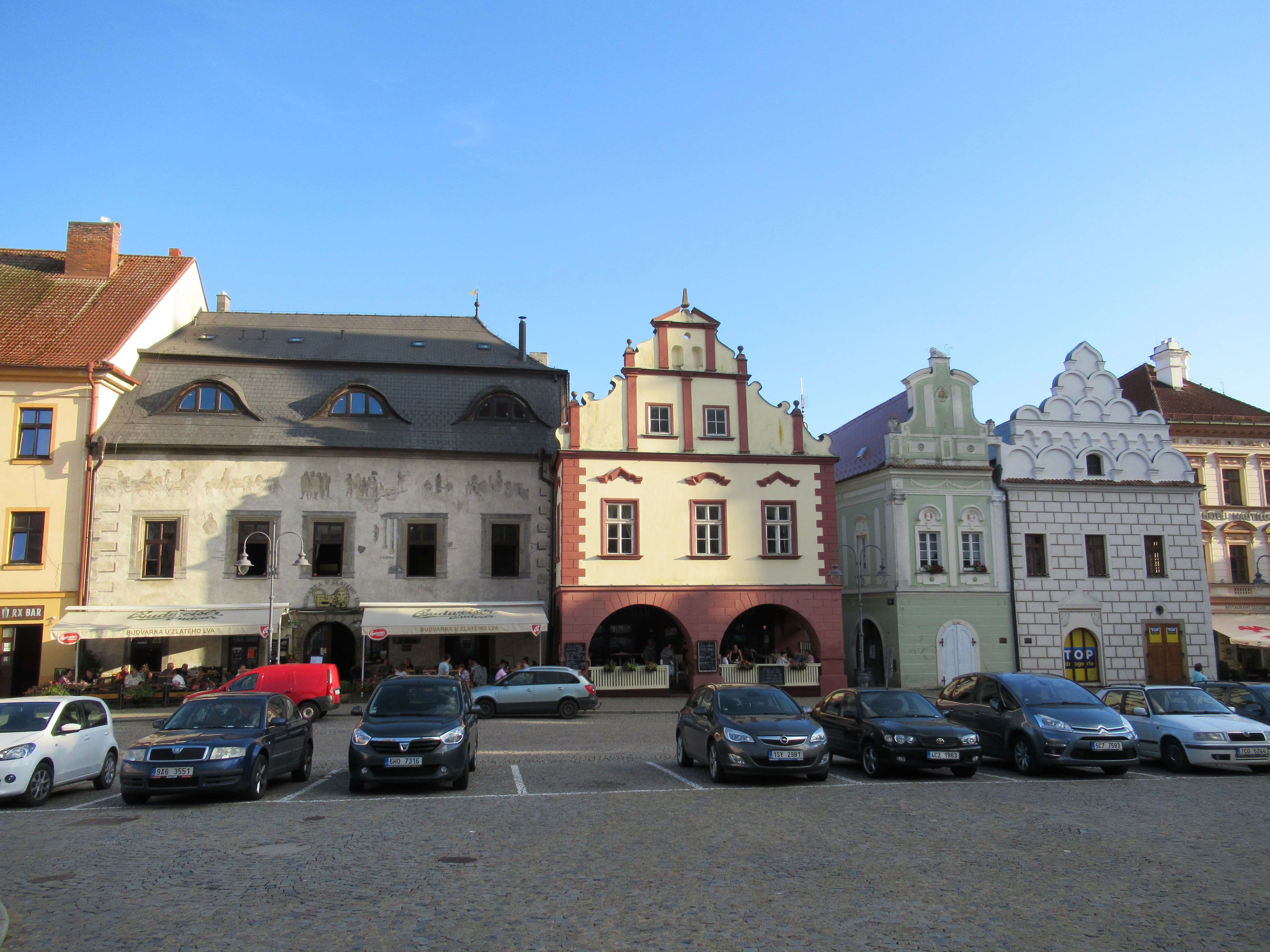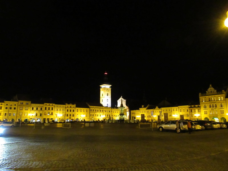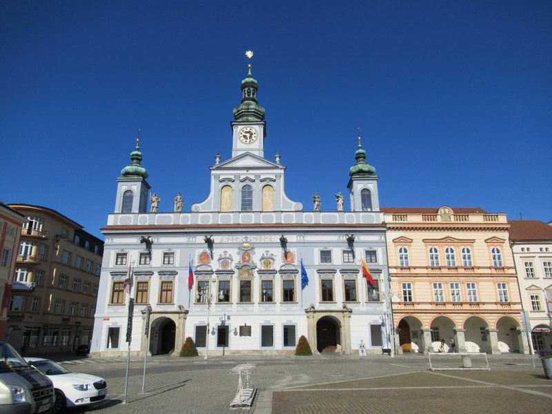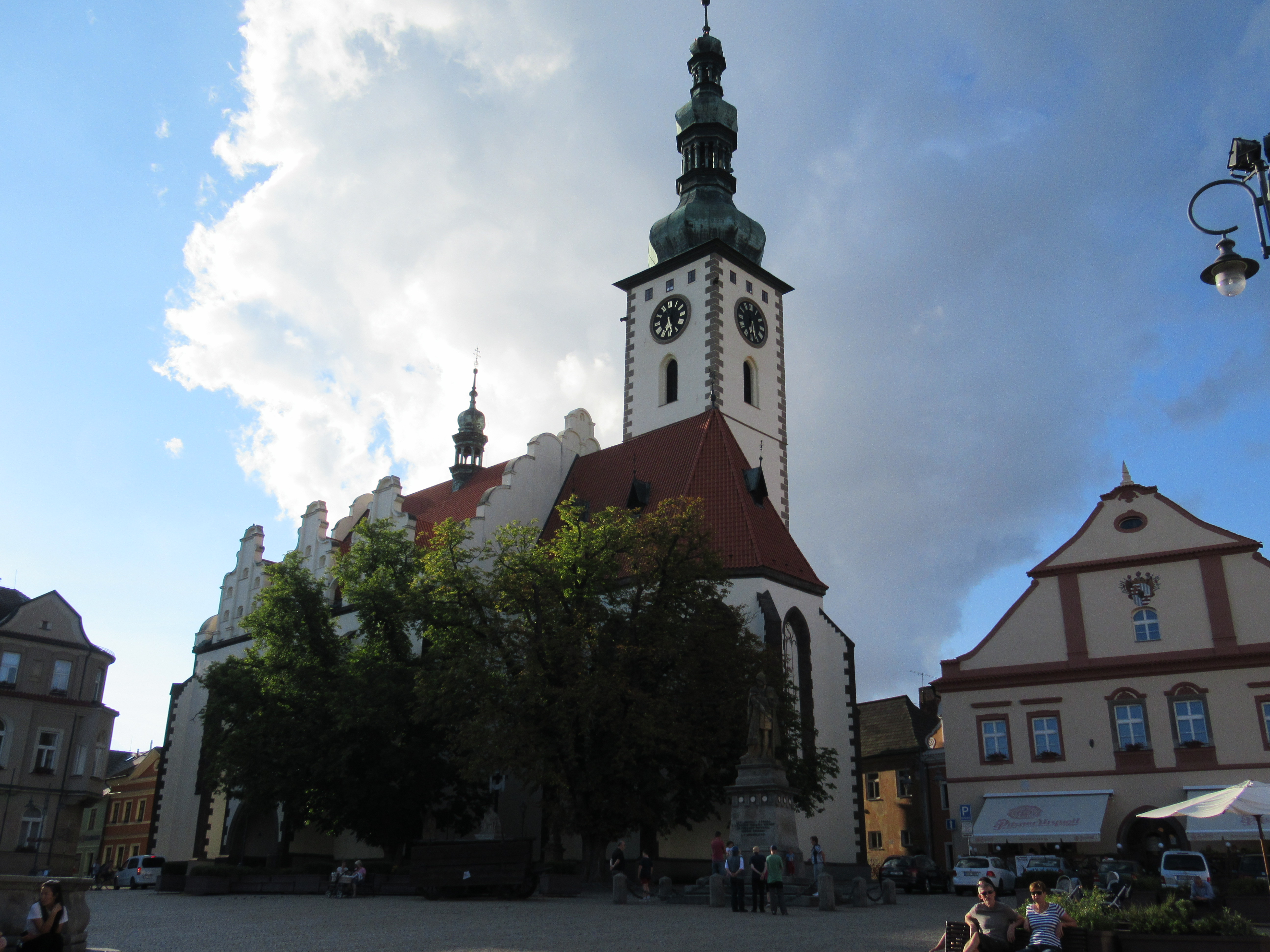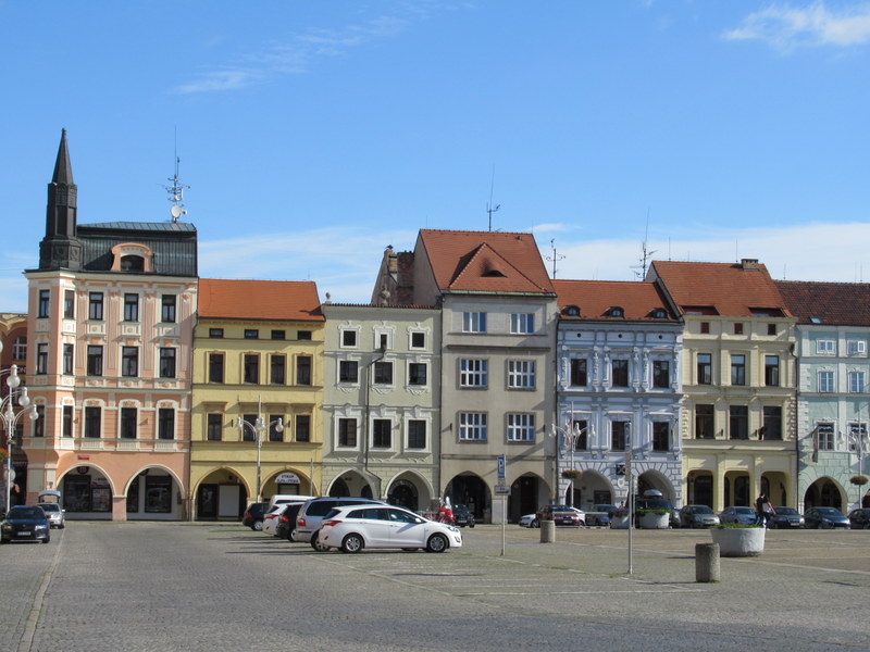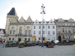 We found a Decathlon sport store on the way into the center of town and did a little window shopping. Our timing was perfect as when we came out of the store it started raining really hard and didn’t stop for about 1/2hr. We just hung out under the eves and when it let up, we started out again. The town square is famous in the CZ for its size and the condition of the buildings that form it. We took a few pictures on the way past.