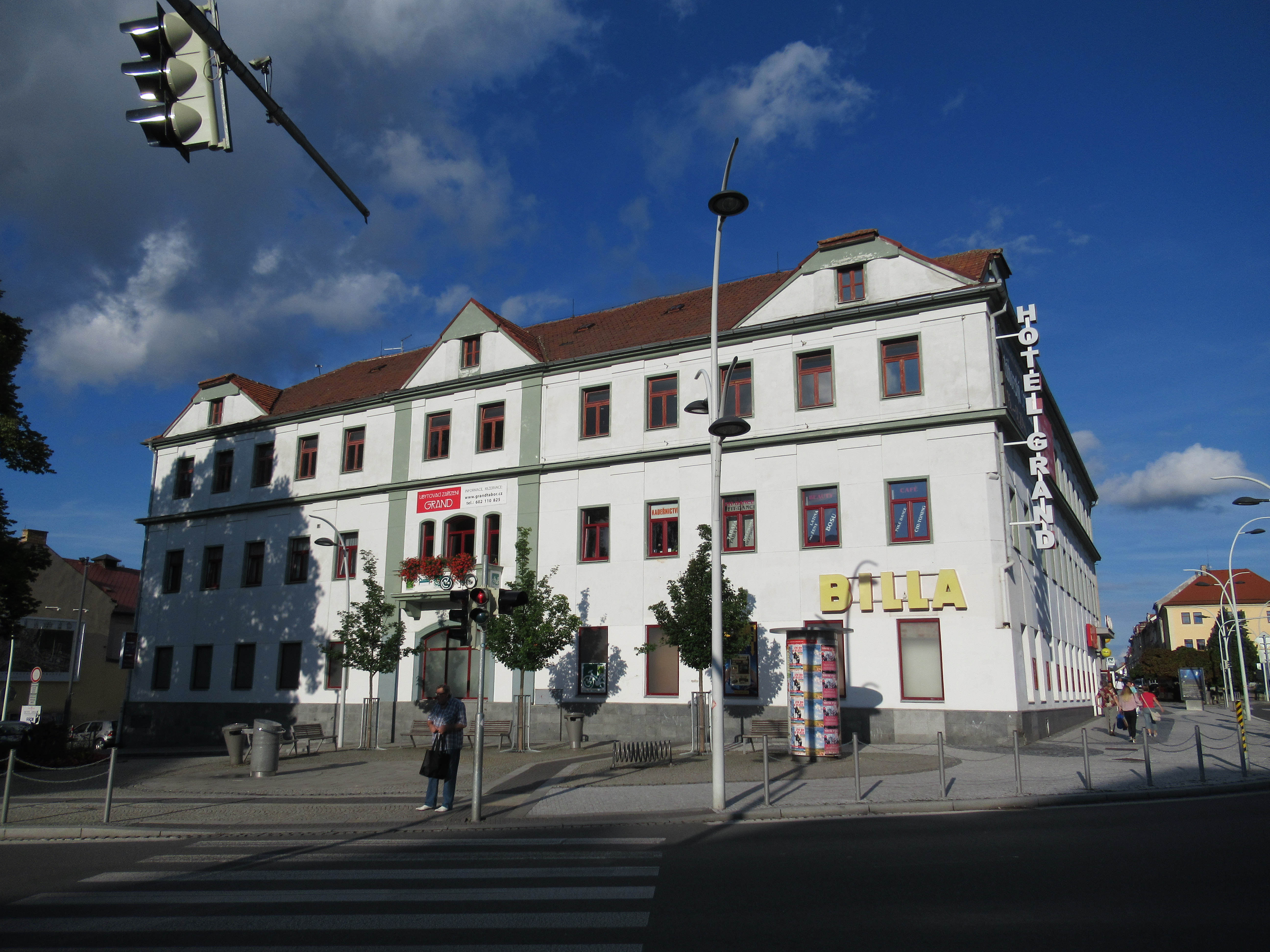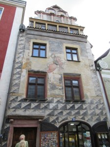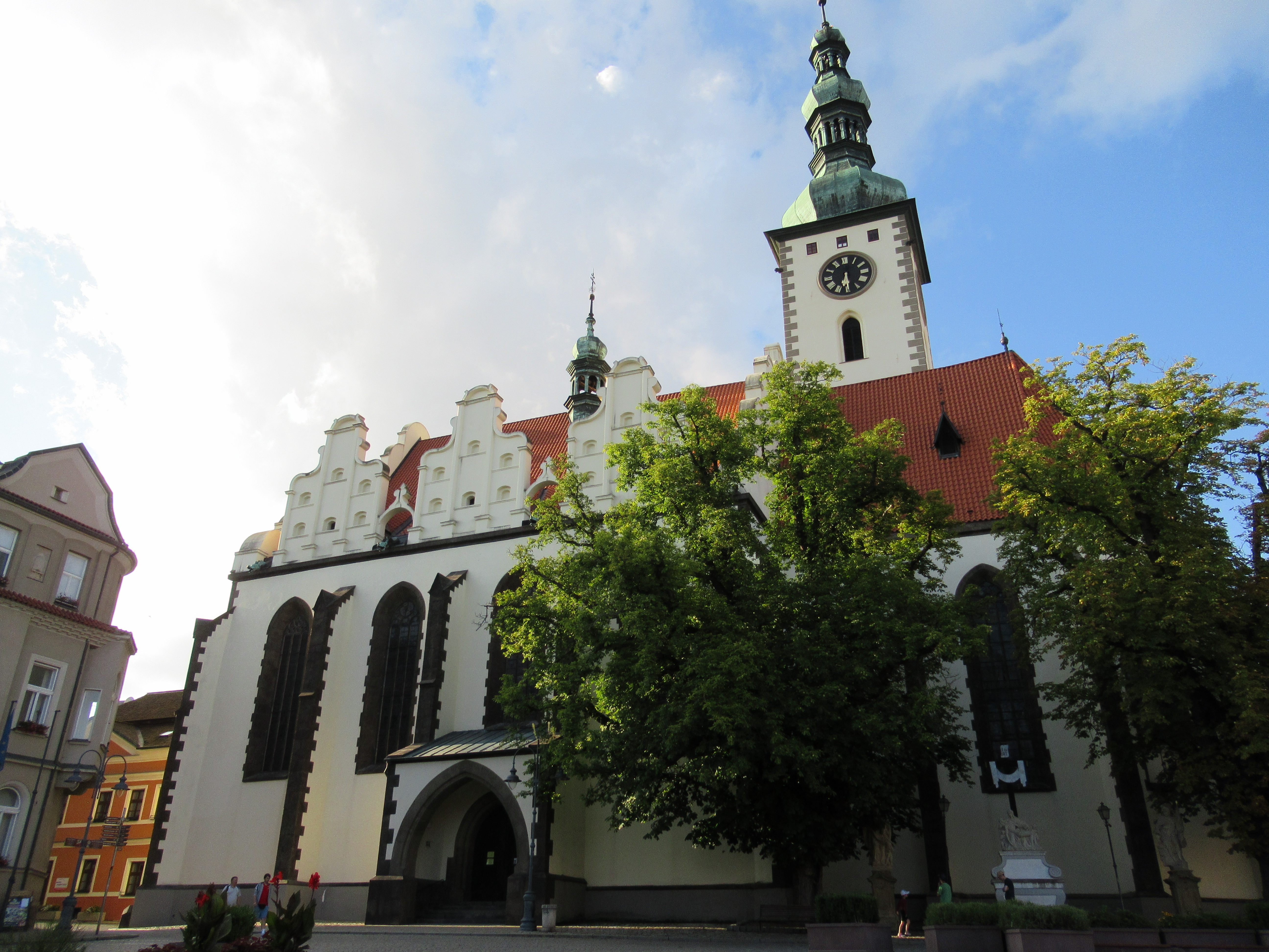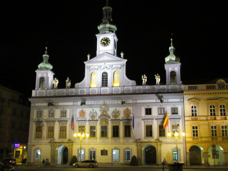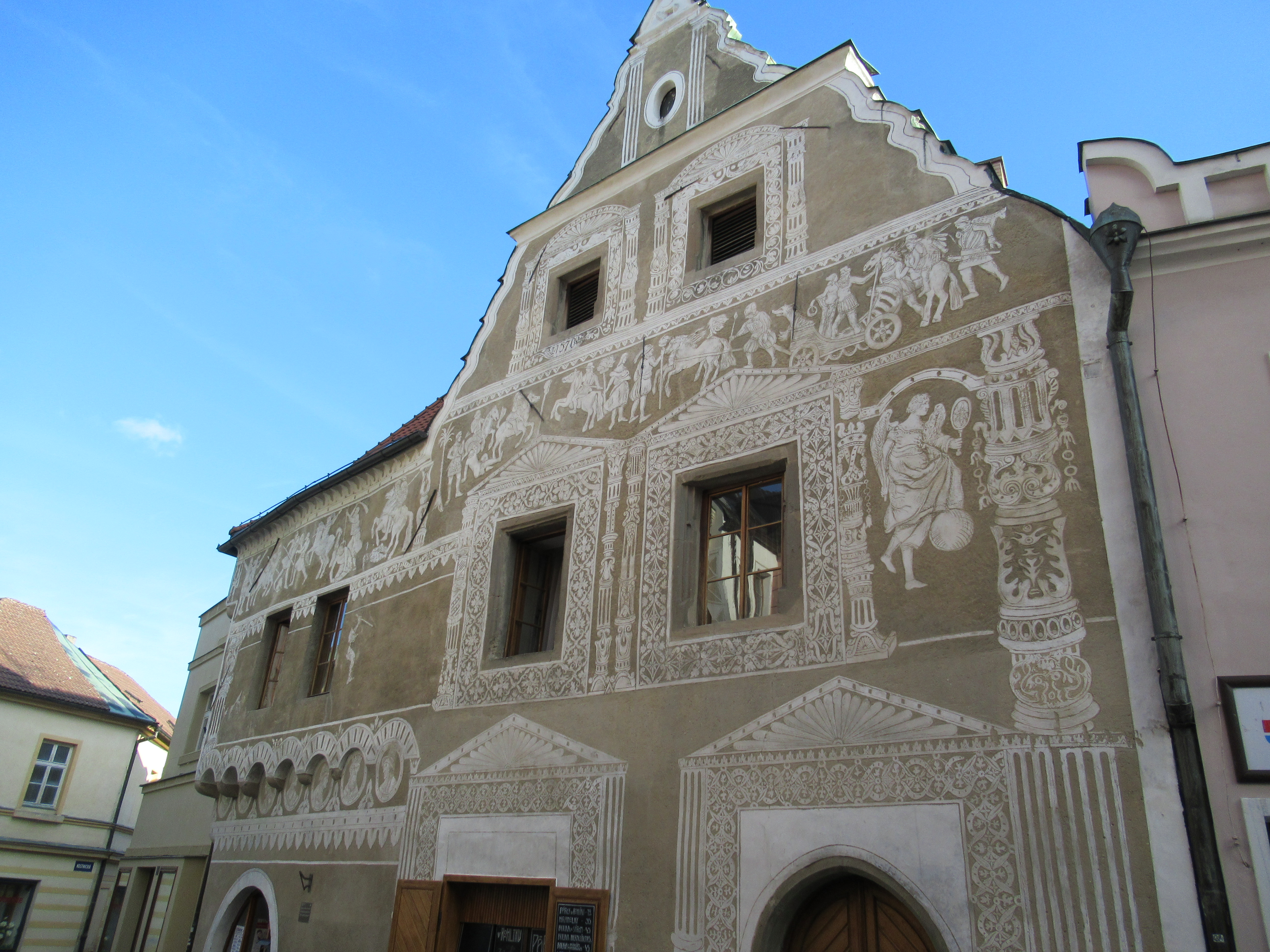 We found a Decathlon sport store on the way into the center of town and did a little window shopping. Our timing was perfect as when we came out of the store it started raining really hard and didn’t stop for about 1/2hr. We just hung out under the eves and when it let up, we started out again. The town square is famous in the CZ for its size and the condition of the buildings that form it. We took a few pictures on the way past.