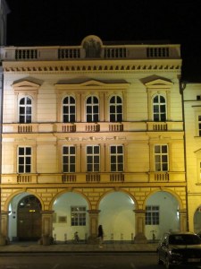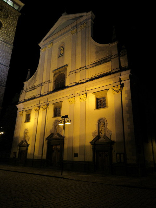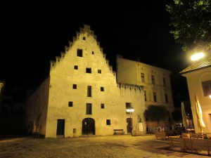 Our hotel is about 10 paces off the main square and our room is huge. Ed still wasn’t feeling so great so Maggie bought dinner from across the street and we ate in our sitting room. At about 9:30 we ventured out to walk around the square and see the old lovely buildings lit up.