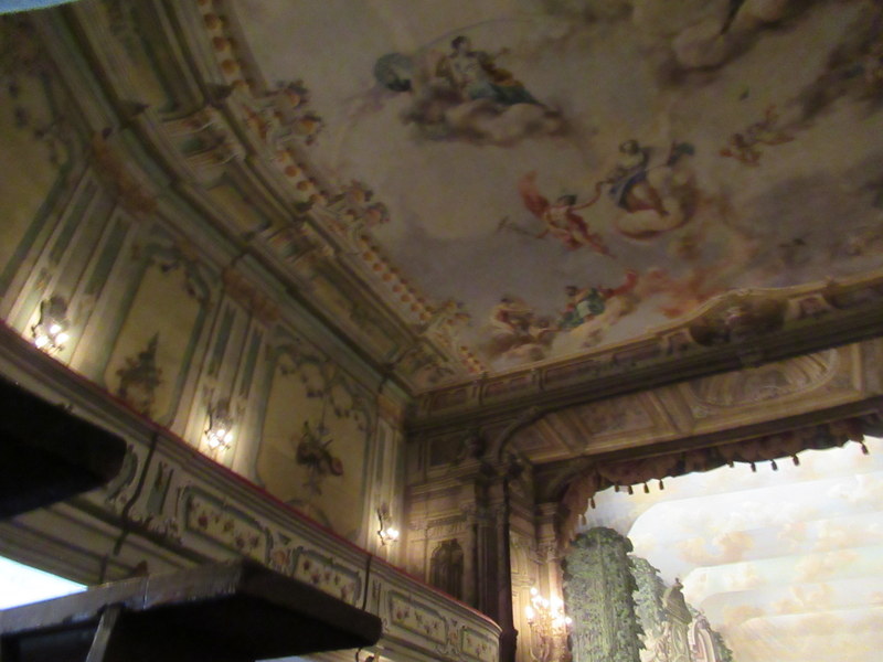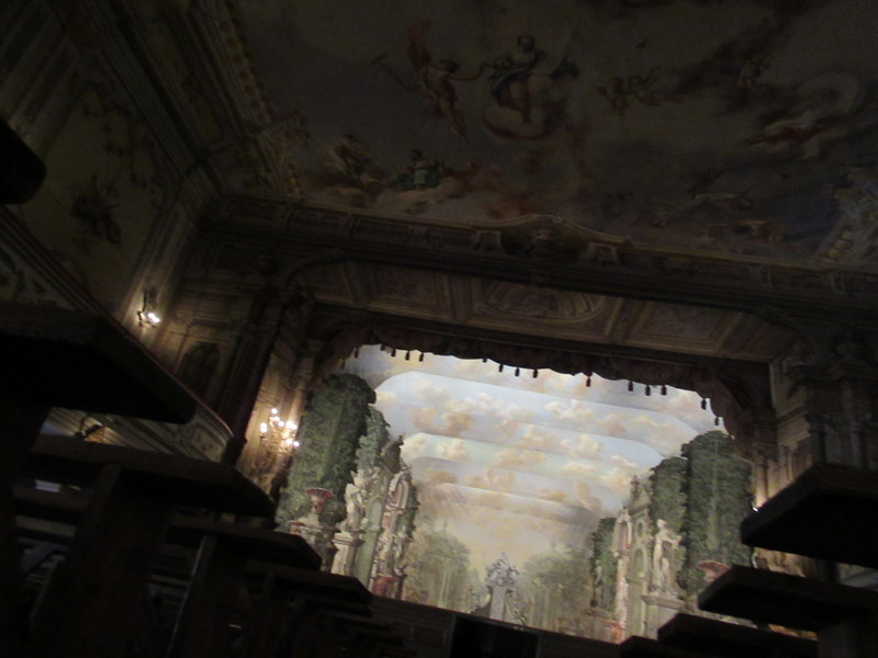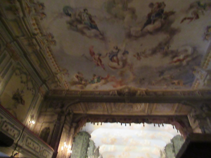 The operas that were performed here during the heyday lasted 5-6 hours. Members of the family Schwartzenberg and their invited guests and nobility would watch parts and then leave via a very long corridor/bridge about 400 yards long part of which was above the theater and which crossed the river which went to the “garden” that we visited yesterday or in the other direction to the castle to a ball.