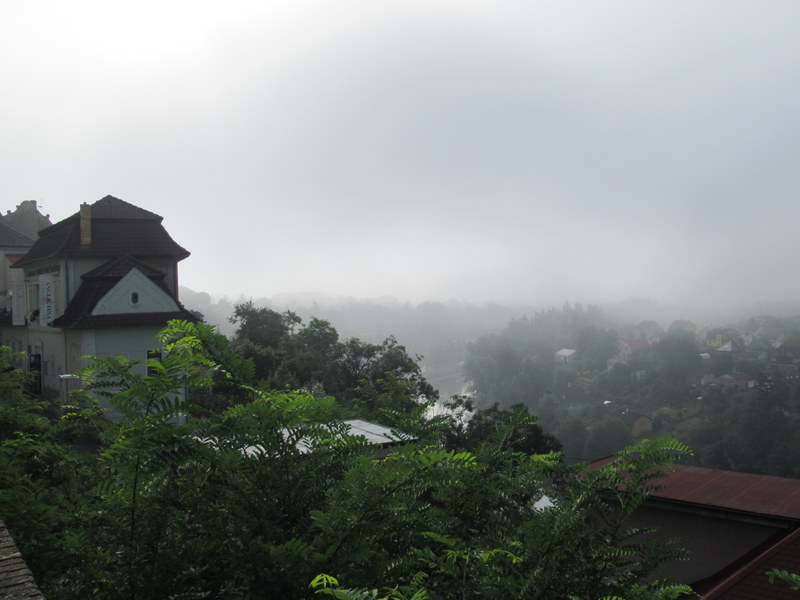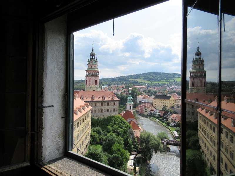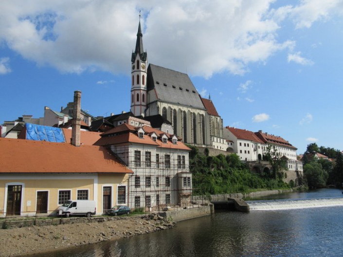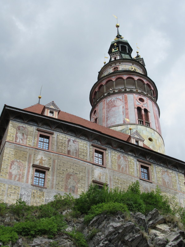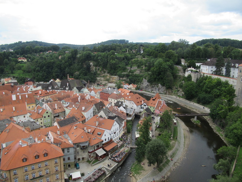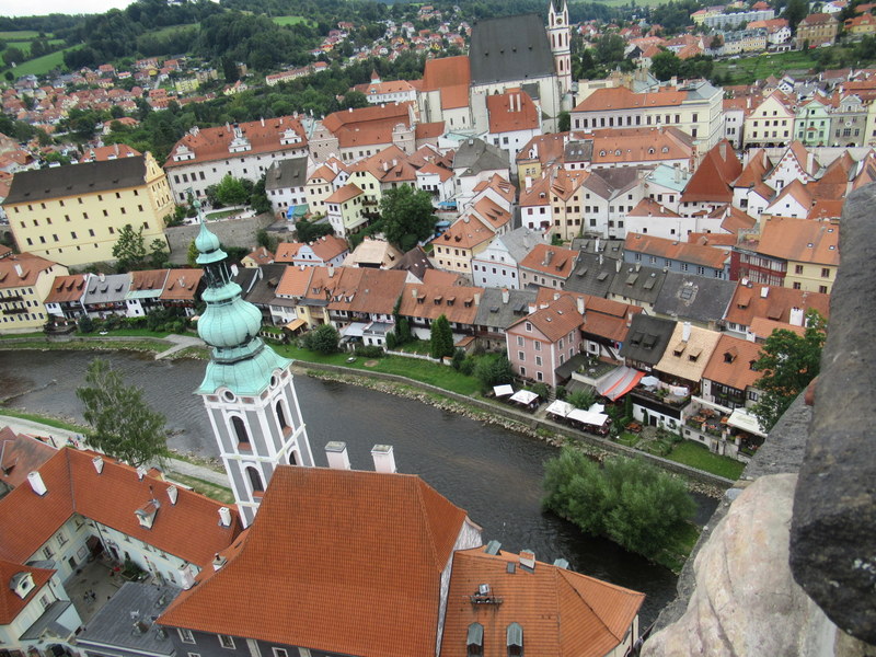 In actuality, it was not a bad as we had anticipated, although the last stretch uphill was made a lot more difficult because of a very poorly maintained gravel road. The last 3 kms. were downhill into the medieval village of Ceske Krumlov. This is a very popular tourist area so we were not anxious to get here too early on a Sunday. Despite some unsettled weather, the town was still crowded. We found our pension after some frustration. It’s right in the middle of the ancient village and a stone’s throw from the castle.