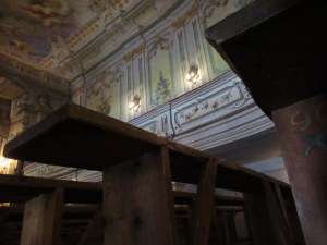 The theater was able to change scenes frequently in 10-12 seconds each that was done by the use of a series of ropes and pulleys rigged under the stage. It could also change the backdrop and raise and lower the curtain in the same way by hoisting and lowering them into and out of the fly loft. Very technical and advanced for 250 years ago. There were trap doors and “elevators” run with counter weights that could raise and lower actors from the stage as if by magic. Pictures by tourists were “limited.”