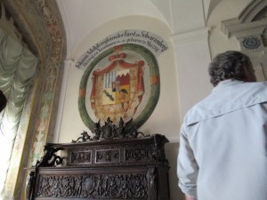 It was about a 15 minute walk up the hill from our hotel. We took the apartments tour that lasted just under an hour (no pictures) and led us through about 16 rooms of the 15th century chateau. The whole thing was remodeled in the 19th century when the Schwartzenburgs whose ownership dated to the 30 years war when one of their clan led the hometown king or emperor to victory. This castle as well as at least one other was erected and furnished to display the family’s prestige and wealth. The place had fantastic wood and beautiful ceilings everywhere. This is in the middle of a huge hunting area so everything was decorated in the dead animal theme with displays of maiming and killing utensils on display at every opportunity, even in the rooms and apartments that were designed for and used by the ladies. They were dark with hunting scenes where there was room on the walls not occupied by antlers and other parts.