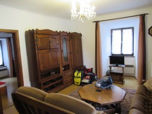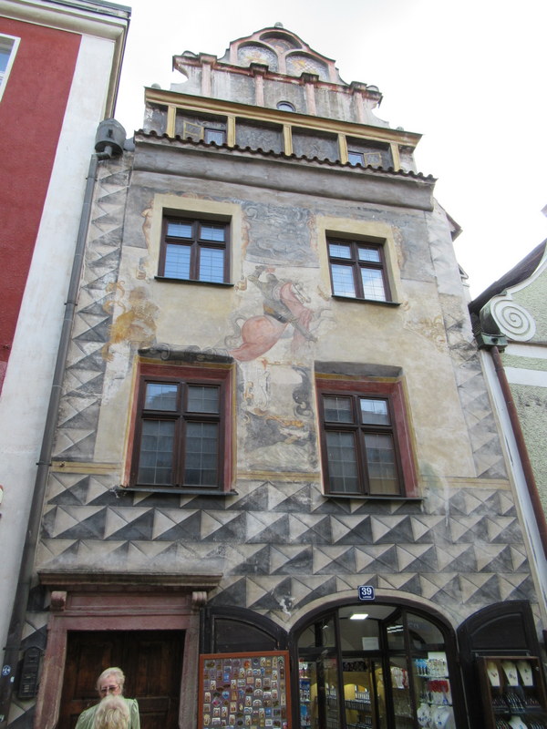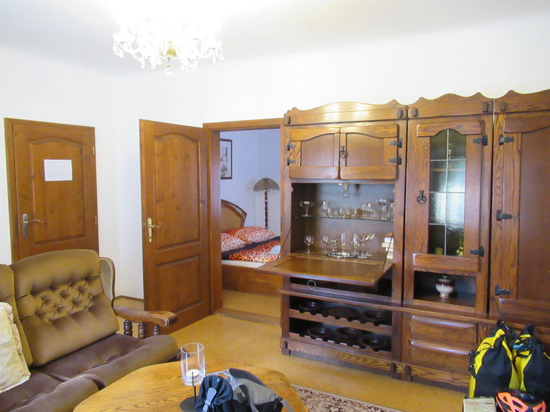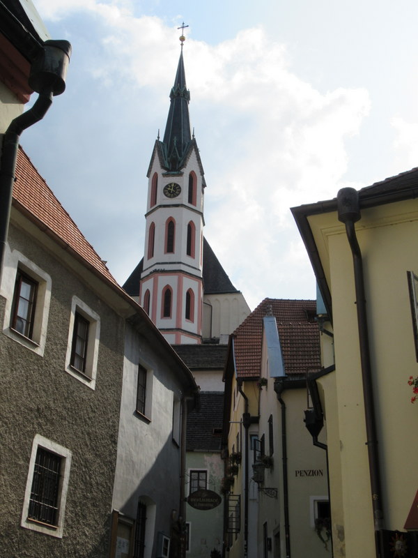 The pension we are staying at is located on the main street (pedestrian) of this well preserved medieval city, just across the Vltava River that separates the royal area from the more plebian area. We are a 2 minute walk to the entrance to the castle and perhaps a 5 minute walk to the main church. Perfect. Since we had made separate reservations for each of the three nights here, we had to move to another room this morning. The one we had was very nice, large, with a private bath and foyer. Breakfast was terrific and delivered on a tray to our door at 8 a.m. as arranged. We packed up and left our panniers in the room for the pension folks to move when they were done cleaning the new room. We returned to the pension around 4 to discover that our new room was actually a suite with a very large living room and bedroom as well as a private bathroom all on the first floor, so one less flight of stairs. All of this for about $10 more.