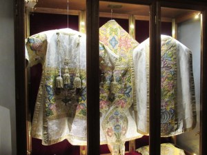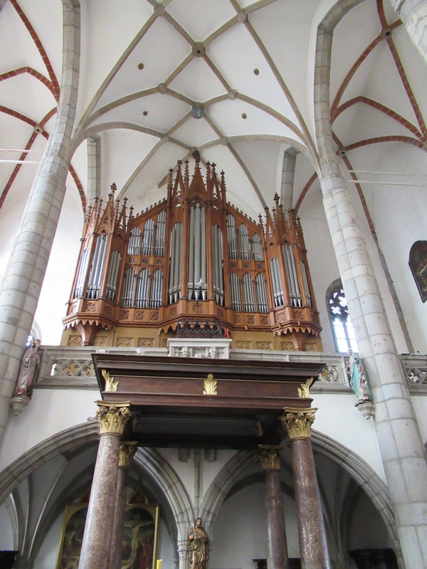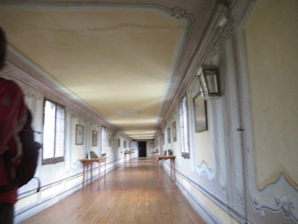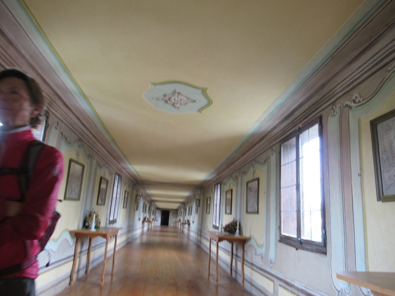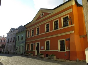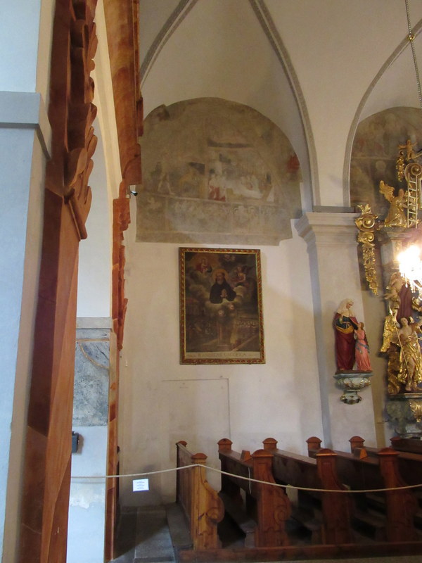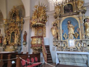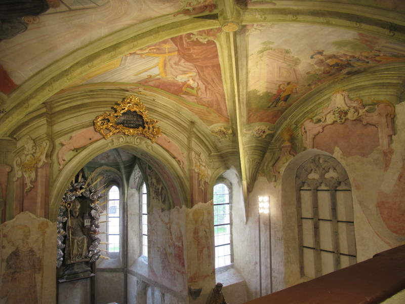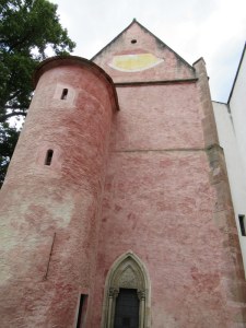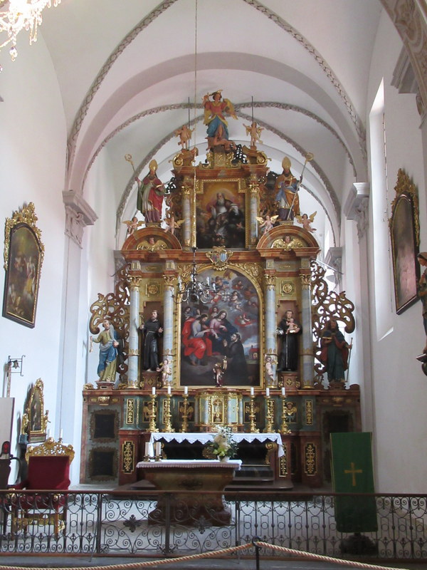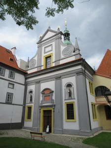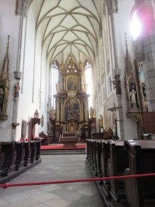 At 4 p.m. we returned to the castle proper and toured the rooms that were restored by the Schwartzenbergs in the middle of the 19th century. We felt that the guide was very friendly, although his pronunciation of words was hard to understand. Think English with a heavy slant toward Czech. The style of furnishings in the rooms was very pretty and he gave a lot of history about the place and family. Very few people took this tour and photos were not permitted. tos. The last part of this tour was the very long corridors above the river and theater which looked to be perhaps 900’ long and gave access to all parts of the castle, the theater and the gardens above. The last thing we did was visit the Cloister of a Monastery down a little alley across from the castle. It had 2 chapels, a large one and a small one. They both were really beautiful with loads of wood and gold about.