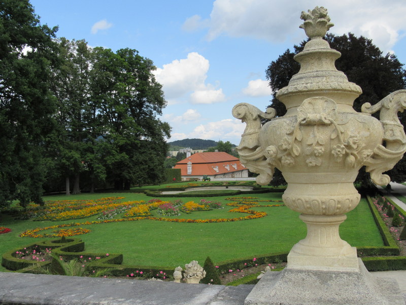 We caught the 10 a.m. tour of the Baroque Theater at the castle. The theater is more than 250 years old. It has been almost completely restored, since, as with most historical sites in the Czech Republic, it suffered severely from neglect for many years, not just when the republic was behind the Iron Curtain. Most of the tour was a video in English of the restoration and workings of the theater backstage. The auditorium is really beautiful with a balcony and loge area and ceilings and walls painted al fresco.
