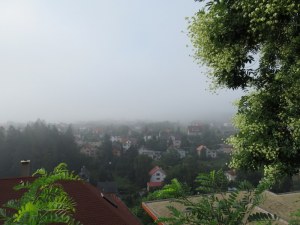 It was raining lightly when we got up with very loud and long claps of thunder. We had a lovely breakfast at the Pension, loaded up with only rain jackets on and took off.
