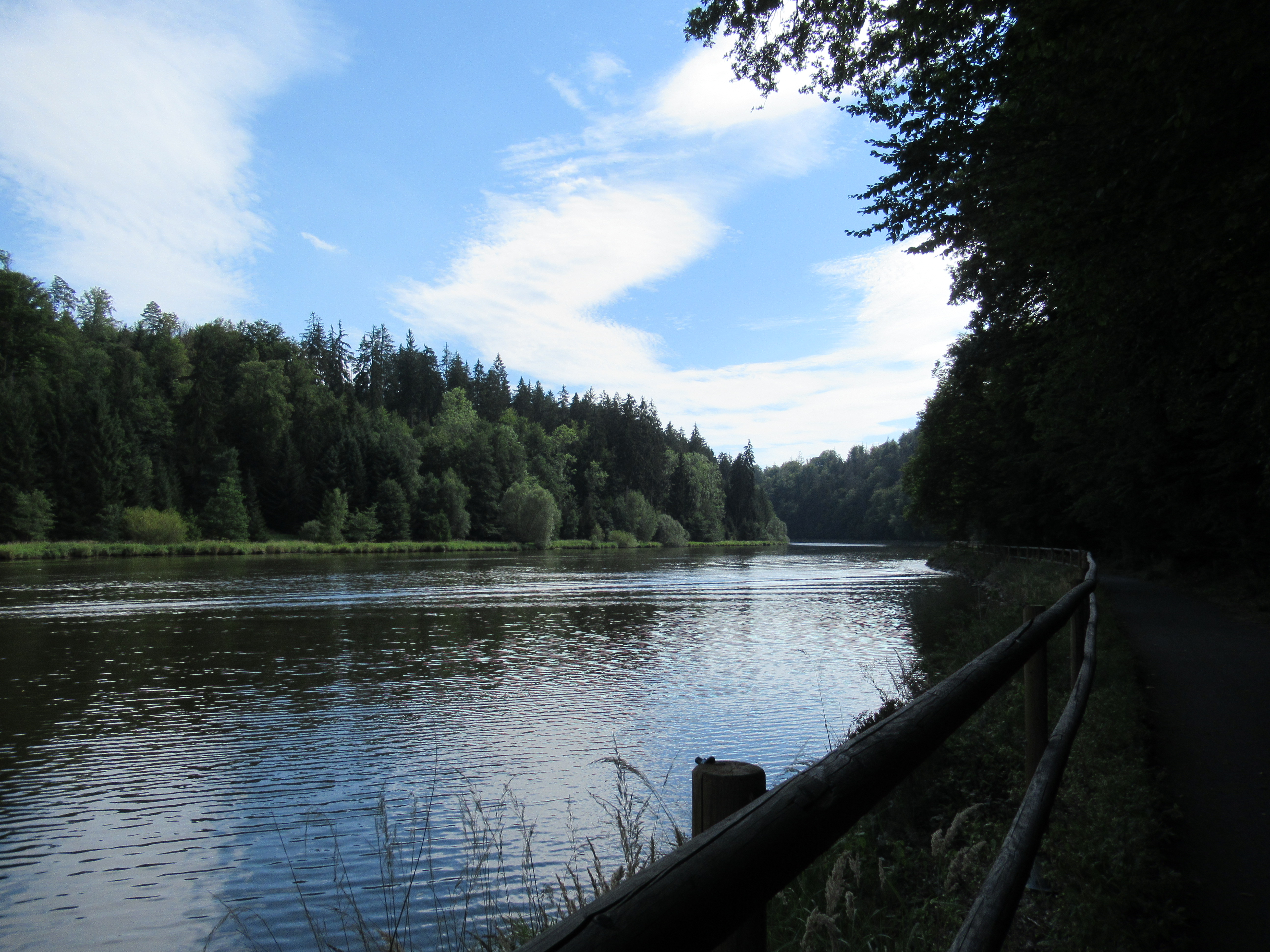 and getting us back in the taxi who had waited for us in about ½ hr. We arrived back in Tyn shortly before noon and took off immediately. By then, it was hot and humid. The route we had worked out yesterday was about 40 kms with a lot of uphill and downhill. Although Ed felt a lot better and no longer had a fever, he felt very weak. The first part of the ride was through farmland. After that we were riding along the river path which was fairly wide and through thick forest. We met a German couple coming the other way who told us that although the map indicated an unpaved portion of bike path ahead for us, there was actually a new paved bike path along the Vltava River all the way to Hluboka nad Vltavou which ended up saving us about 6 kms of riding on dirt and gravel.